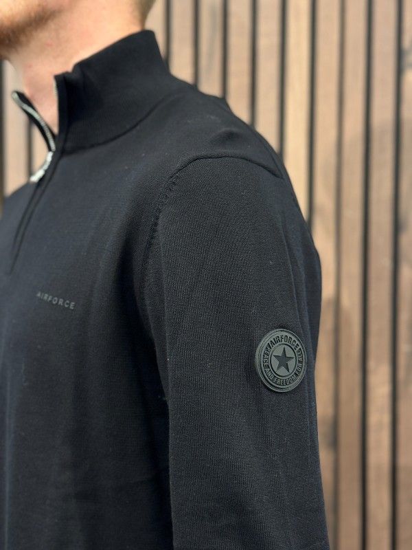 De Airforce Knitwear Quarter Zip trui is een must-have voor iedere garderobe. Deze zwarte herentrui van Airforce heeft een eigentijds design met een praktische hoge kraag en comfortabele pasvorm. Perfect voor frisse dagen of als stijlvol accent in je outfit. De hoge kraag met ritssluiting geeft de trui een stoere en moderne uitstraling. Combineer deze zwarte trui gemakkelijk met een bijpassende broek of je favoriete jeans. Voeg een beetje stijl en comfort toe aan je dag met deze trendy Airforce trui. Mis de kans niet om deze veelzijdige en stijlvolle toevoeging aan je kledingkast aan te schaffen.
