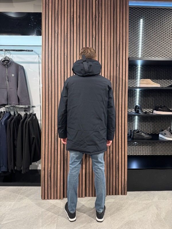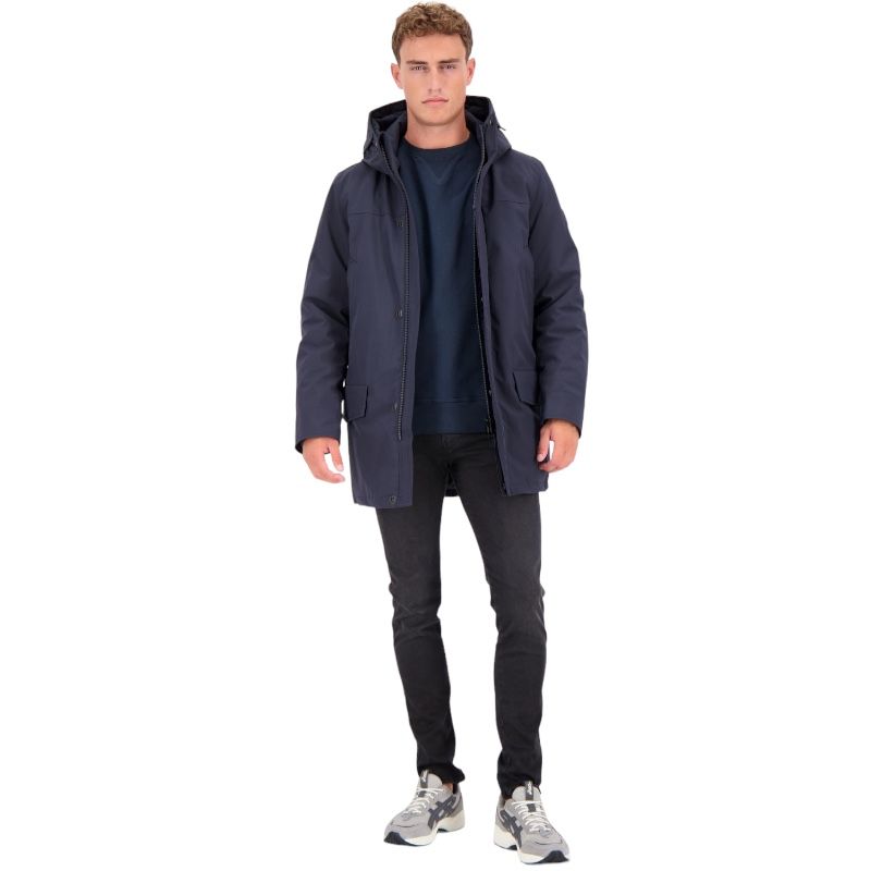 Deze donkerblauwe Airforce winterjas voor heren is gemaakt van winddicht, waterafstotend materiaal en heeft een vaste capuchon met kraag die goed hoog gesloten kan worden. De herenjas is voorzien van vier zakken op de voorzijde; twee borstzakken en twee op de heup, tevens heeft de jas een binnenzak met ritssluiting. De mouwen sluiten aan de onderzijde goed aan door de elastische boorden met thumb-holes.