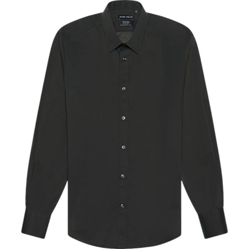 Deze zwarte blouse in super slim fit is gemaakt van soft touch stretch katoen, wat zorgt voor een uiterst comfortabele en flexibele pasvorm. Het strakke, moderne ontwerp maakt het een perfecte keuze voor een verfijnde, casual look met veel bewegingsvrijheid.