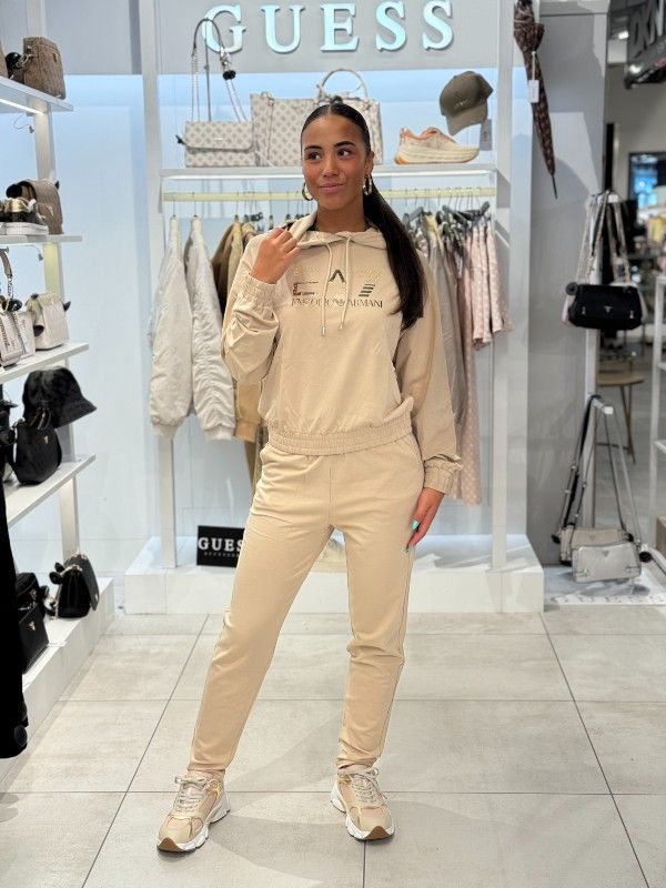 Dit beige joggingpak van Armani EA7 straalt comfort en luxe uit. De trui is voorzien van een groot goudkleurig EA7 logo op de borst, afgewerkt met verfijnde gouden details. De bijpassende broek heeft het EA7 logo op de achterkant en is uitgerust met een elastische tailleband en trekkoord voor een perfecte pasvorm. Het joggingpak is gemaakt van mooi materiaal met veel stretch, wat zorgt voor ultiem draagcomfort en een stijlvolle look.