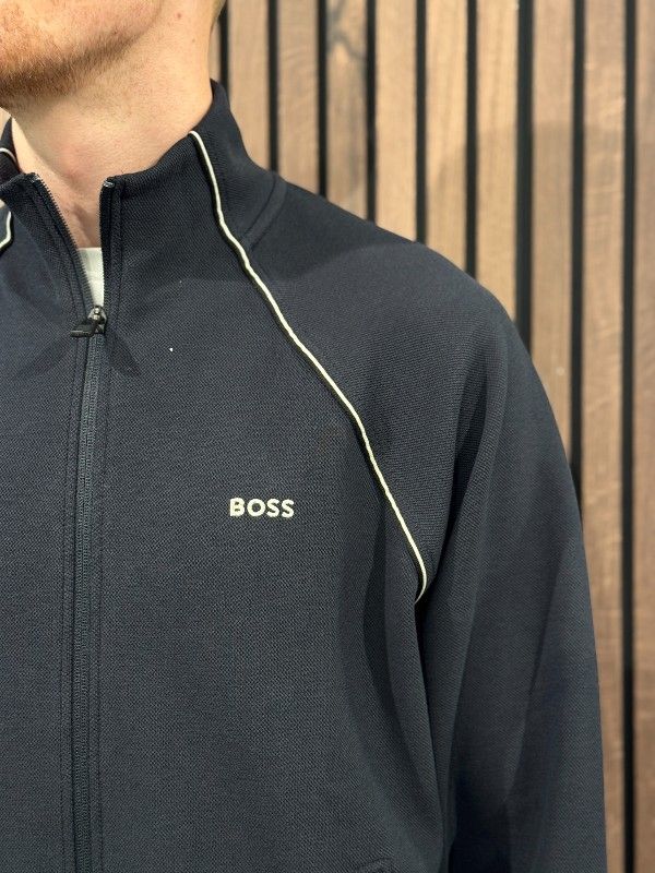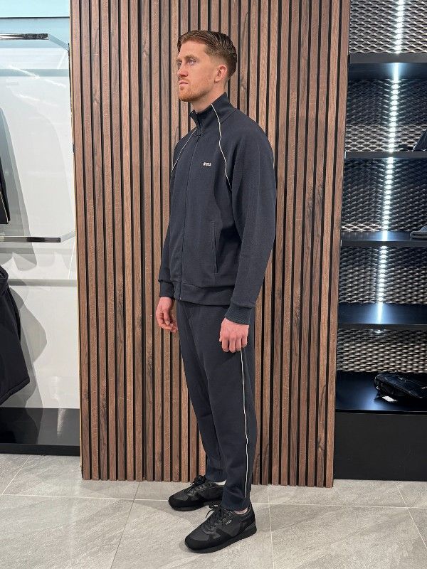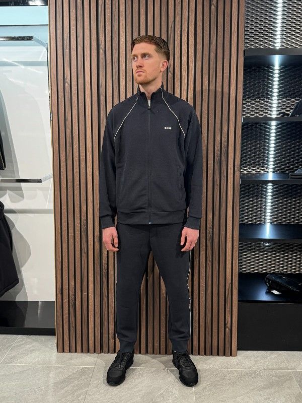 De Boss SW_Tracksuit Set in blauw is jouw nieuwe favoriete heren joggingpak. Deze sportieve set heeft een comfortabele pasvorm en is gemaakt van zacht joggingmateriaal. Het pak is voorzien van een handige ritssluiting en praktische steekzakken voor al je essentials. Met het subtiele Boss logo op de borst straal je eenvoud en stijl uit. Deze blauwe tracksuit van Boss is perfect voor een relaxte dag of casual uitje. Mis het niet en voeg dit veelzijdige joggingpak toe aan je garderobe.