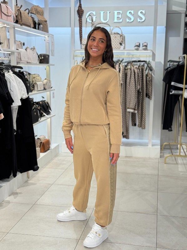 Dit beige vest van Guess is perfect te matchen met een bijpassende joggingbroek! Het vest is voorzien van een fijne rits, een mooie Guess logoband en een logo op de borst.