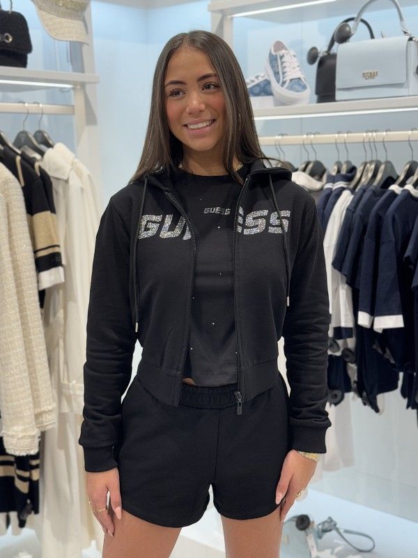 Deze zwarte short uit de Guess Active lijn is ideaal voor sportieve gelegenheden! De Guess short heeft aan de bovenzijde een elastieken band zodat de korte broek goed aansluit bij de heupen. Op de broekspijp zit een Guess logo, bewerkt met zilveren strass steentjes.