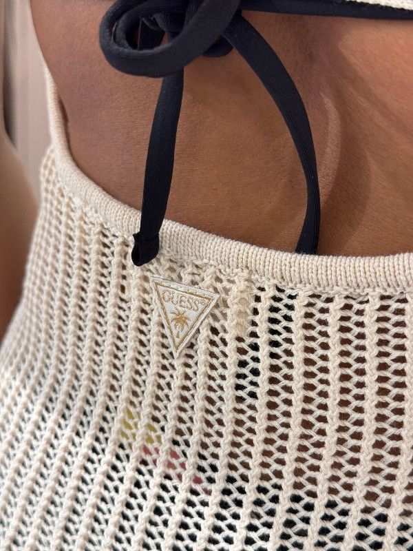 De GUESS Aura Net Stitch Dress in beige is de perfecte damesjurk voor een zomerse look. Deze beige jurk van gehaakt materiaal heeft een luchtige uitstraling en is ideaal als cover up over je bikini. De stof schijnt licht door, wat zorgt voor een speels en zomers effect. Dankzij het design draag je deze GUESS jurk comfortabel en stijlvol. Perfect voor een dagje strand of zwembad.