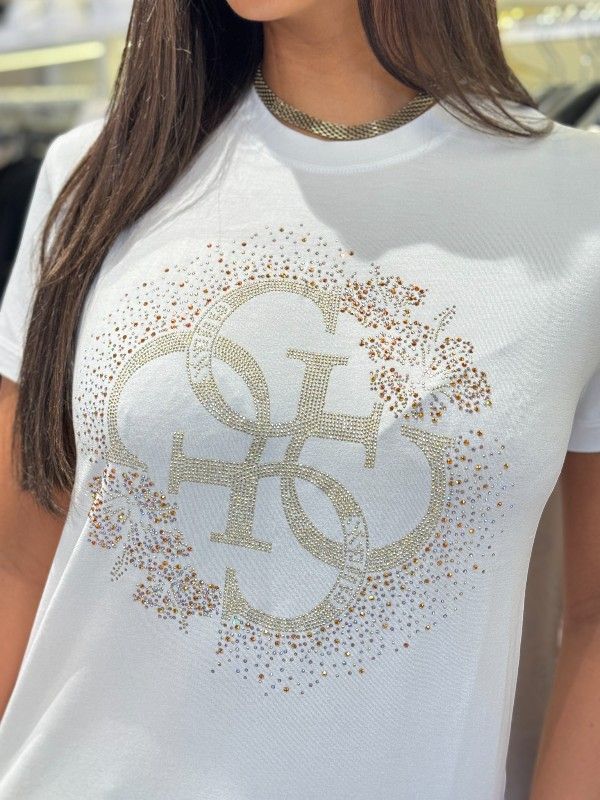 Het Guess Corinne Ss T-shirt in wit is een must-have voor je garderobe. Dit dames T-shirt met korte mouwen valt op door de opvallende Guess 4G's logoprint op de borst, verfraaid met sprankelende strass steentjes. De ronde hals geeft een comfortabele pasvorm. Dit witte Guess T-shirt is eenvoudig te combineren en ideaal voor een casual dagje uit. Voeg een vleugje flair toe aan je outfit met dit trendy Guess shirt!