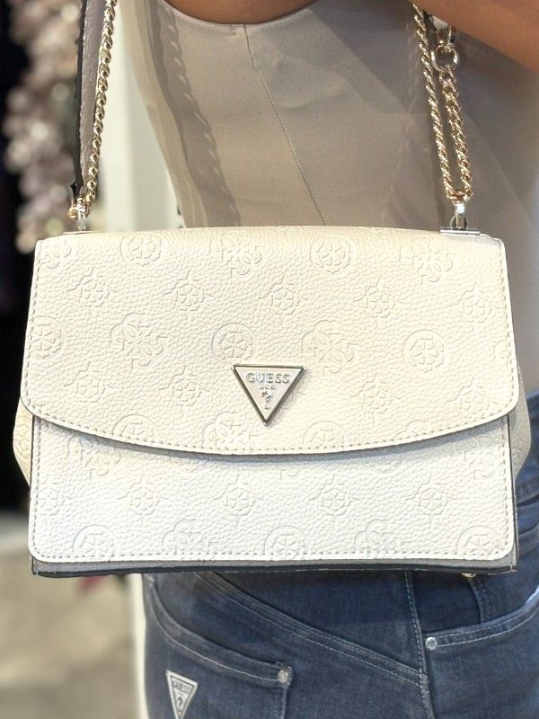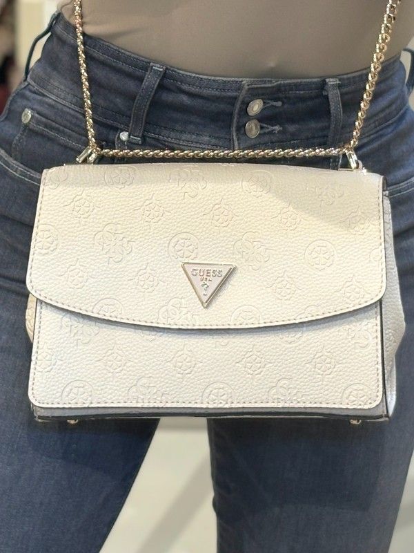 De GUESS Cresidia II Cnvrtbl Xbody Flap in wit is de must-have damestas voor je collectie. Deze witte crossbody tas Is ideaal voor elke gelegenheid. Het Guess 4G's logoprint geeft deze tas een stijlvolle uitstraling. De tas heeft een middelmaat, perfect voor al je essentials, en sluit met handige drukknopen. Draag de tas crossbody voor een trendy look of als schoudertas voor extra comfort. De GUESS Cresidia II in wit met het iconische GUESS 4G's logo is een stijlvolle aanwinst voor elke outfit!