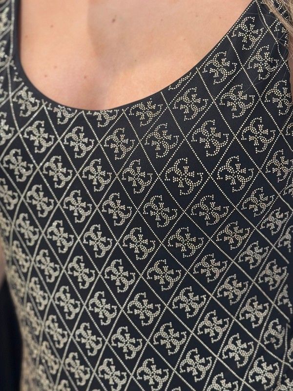 Dit Guess badpak in zwart is voorzien van de herkenbare 4G logoprint en afgewerkt met strass steentjes voor een opvallende uitstraling. Het model heeft een aansluitende pasvorm met een cheeky fit aan de achterkant, waardoor het iets minder bedekt dan een klassiek badpak. De combinatie van het logo en de glanzende details geeft het badpak een trendy look. Perfect voor zonnige dagen aan het strand of bij het zwembad.