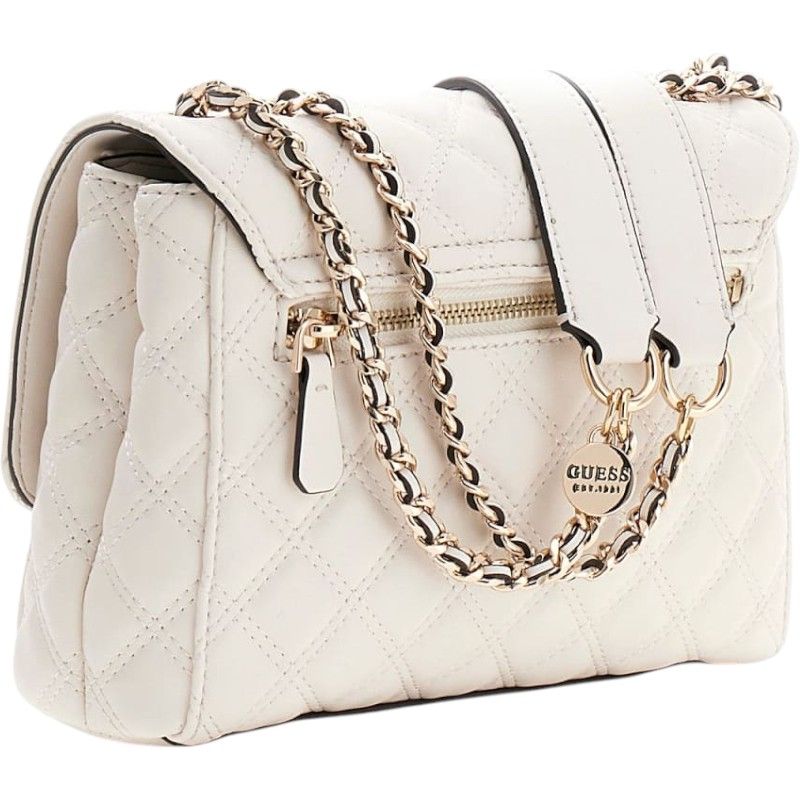Beige Guess tas met een stijlvolle 3D triangle logo op de voorzijde. De tas sluit met een magnetische sluiting en heeft twee vakken aan de binnenzijde. Aan de buitenkant vind je een extra ritsvak op de achterzijde. Mooi afgewerkt met stiksels.