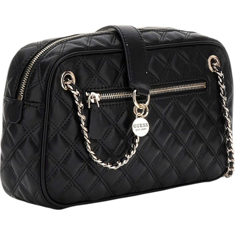 Deze zwarte Guess Giully II Shoulder Satchel is bewerkt met stiksels en gouden accenten. De damestas heeft een convertible schouderband en op de achterzijde een vakje met rits.