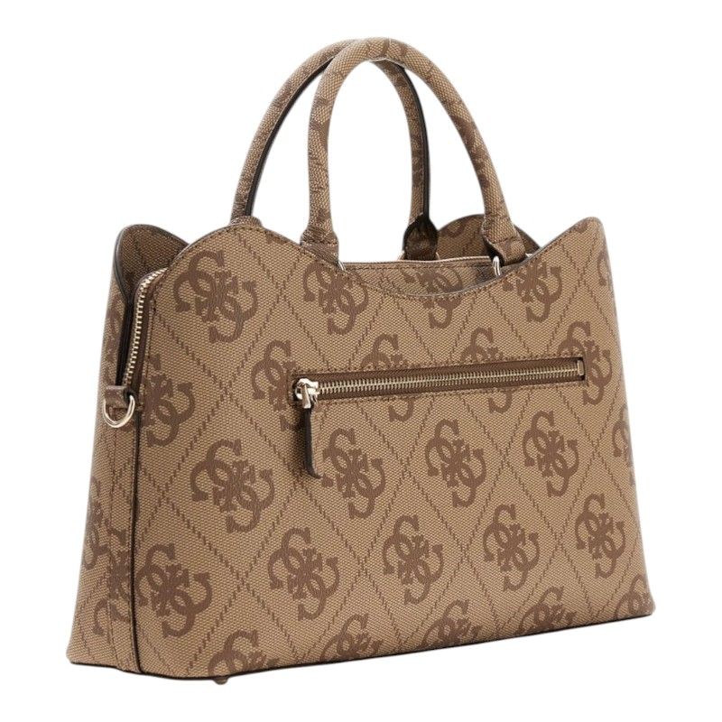 De GUESS Janie Logo Girlfriend Satchel in bruin is de ultieme trendy damestas voor je collectie. Deze bruine satchel valt direct op door de iconische Guess 4G's logoprint en het stijlvolle Guess 4G logo. Met een lange band is deze tas ideaal als schoudertas of crossbody te dragen. De ritssluiting zorgt voor extra veiligheid van je essentials. Voeg stijl en functionaliteit toe aan je outfit met deze bruine GUESS satchel. Mis deze must-have niet en geef je look een trendy boost!