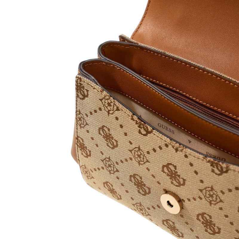 De Guess Melinda Logo Top Handle Flap in beige is de perfecte damestas voor elke gelegenheid. Deze crossbody tas heeft een opvallende Guess 4G logoprint en is een echte eyecatcher. Dankzij de handige top handle en de mogelijkheid om hem crossbody te dragen, biedt deze beige tas veelzijdigheid voor elke dag. Met een flap-sluiting hou je al je essentials veilig. Deze Guess tas in beige is ideaal voor een trendy look.