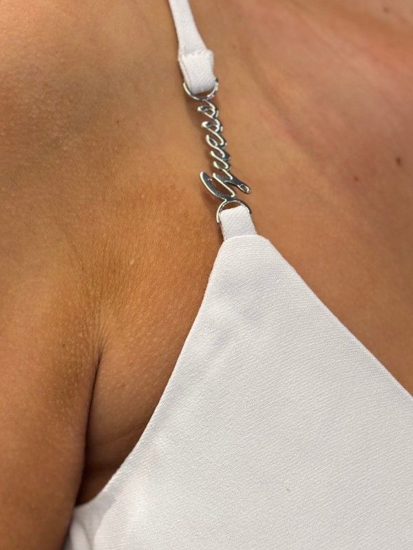 De Guess New Sl Caroline Logo Tank in wit is dé must-have dames top voor je garderobe. Gemaakt van glanzend satijn, voelt deze witte Guess tank heerlijk zacht aan. De verstelbare bandjes zorgen voor een perfecte pasvorm en extra comfort. Deze top is veelzijdig; draag 'm nonchalant bij je favoriete jeans of chic onder een blazer voor een meer geklede look. Gegarandeerd een favoriete keuze voor elke gelegenheid! Voeg de satijnen Guess New Sl Caroline Logo Tank in wit toe aan je collectie en blijf stijlvol en comfortabel.
