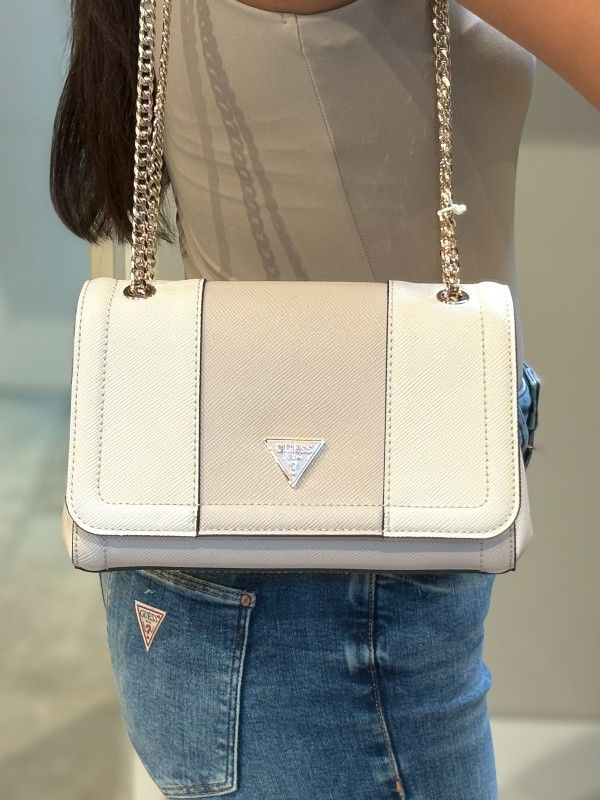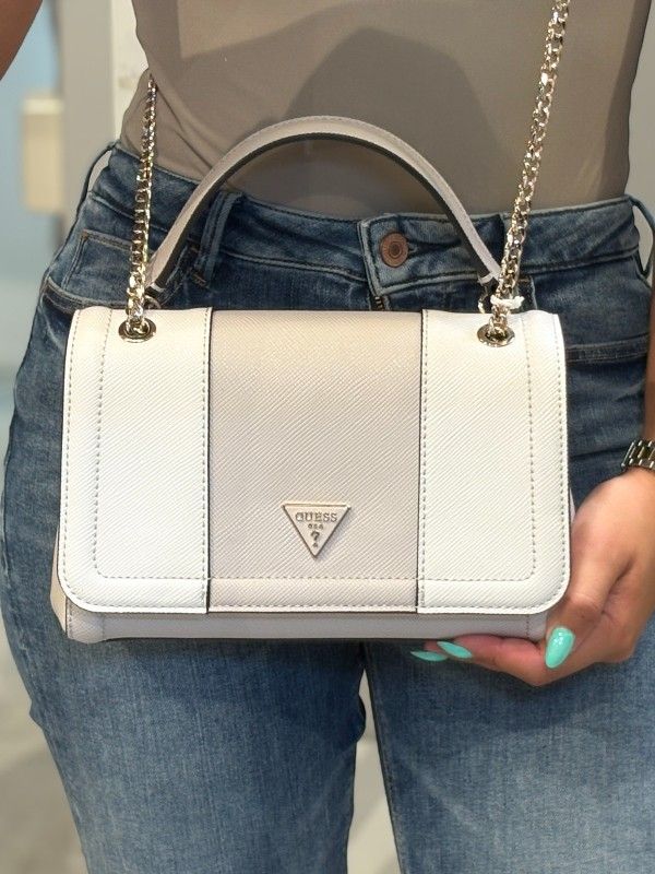 De Guess Noelle tas in beige met wit heeft een herkenbaar triangle logo op de voorzijde. De tas sluit met een magnetische drukknoop en is voorzien van een lange schouderketting. Handig en stijlvol voor dagelijks gebruik.