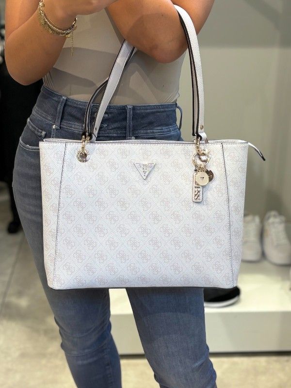 De Guess Noelle II Tote in trendy beige is een must-have damestas voor elke fashionista. Deze stijlvolle satchel is gemaakt van stevig materiaal, perfect voor dagelijks gebruik. De handige rits zorgt ervoor dat al je spullen veilig opgeborgen zijn. De tas is versierd met de opvallende Guess 4G's logoprint en het iconische Guess logo, wat zorgt voor een herkenbare en modieuze uitstraling. De Noelle II Tote is ideaal voor elke gelegenheid, of je hem nu als handtas of schoudertas draagt. Maak jouw outfit compleet met deze trendy en praktische tas van Guess. Voeg hem nu toe aan je collectie!