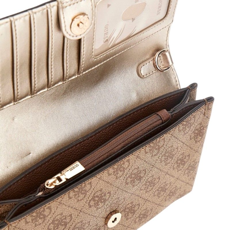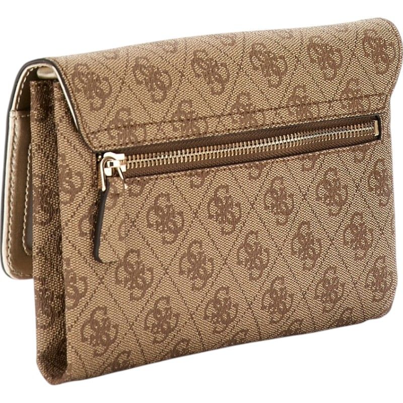 Deze beige clutch van Guess is bewerkt met een all-over 4G logoprint. Op de voorzijde staat het bekende triangle logo en de clutch opent met een magnetische sluiting. Aan de binnenzijde is ruimte voor je telefoon, pasjes en muntgeld. Op de achterzijde zit een handig ritsvakje. De clutch wordt geleverd met een afneembare lange band.