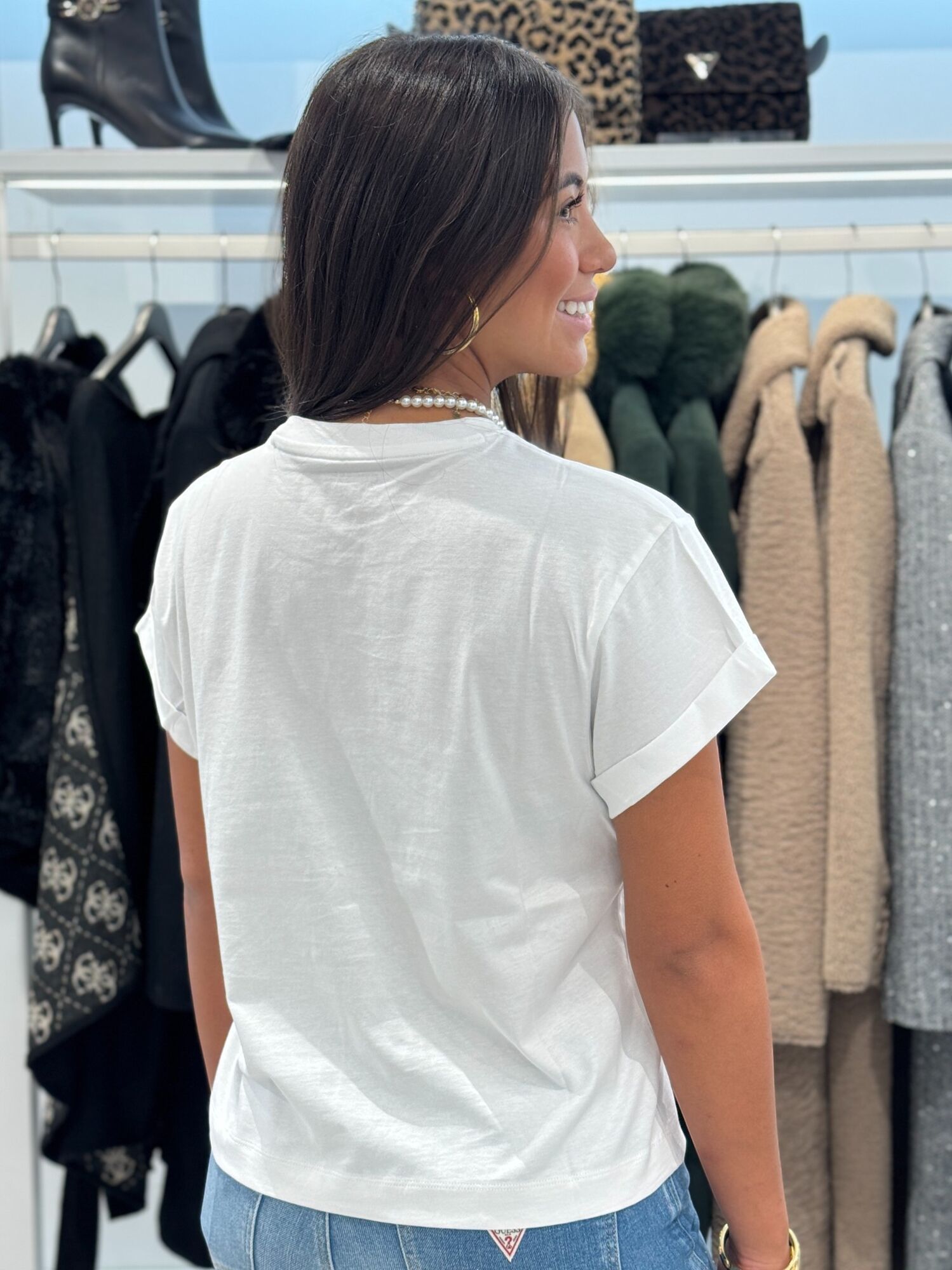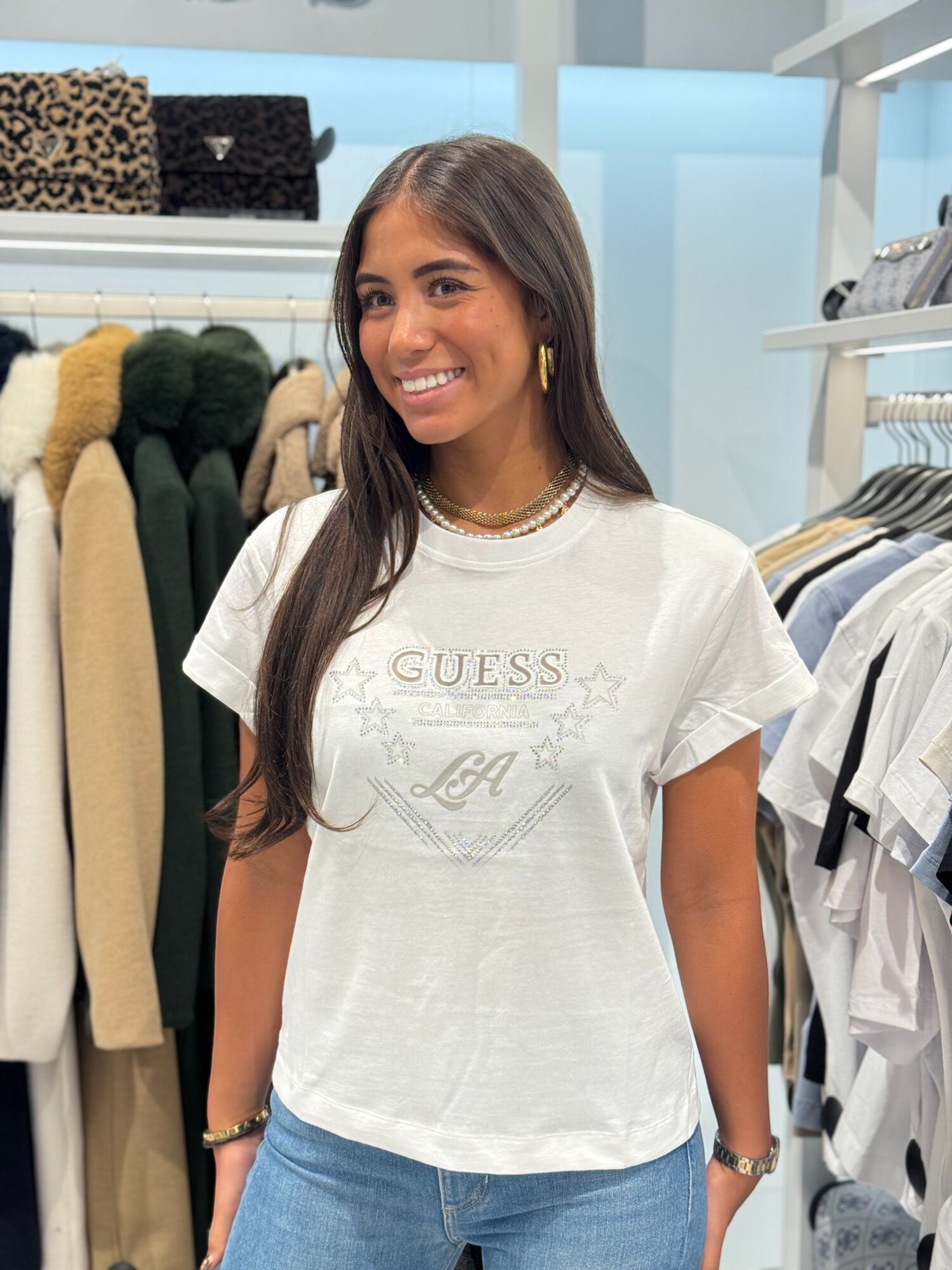 De GUESS Ss Cn La Stars Tee in wit is een must-have voor je garderobe. Dit dames T-shirt met korte mouwen komt in een frisse witte kleur die makkelijk te combineren is. Ideaal voor een casual en trendy look, of je het nu draagt met een rok of je favoriete jeans. Het GUESS logo geeft dit witte T-shirt een stijlvolle touch. Voeg hem snel toe aan je collectie.