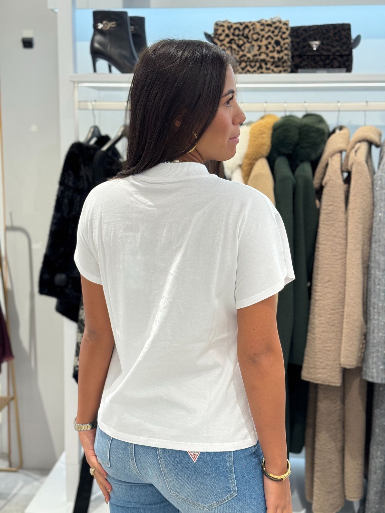 Het Guess SS CN Popcorn Tee in wit is een trendy must-have voor elke garderobe. Dit veelzijdige dames T-shirt heeft korte mouwen en een comfortabele pasvorm, perfect voor een casual look. De frisse witte kleur maakt het makkelijk te combineren met al je favoriete outfits. Verwen jezelf met de zorgeloze stijl van deze witte Guess top. Dit Guess T-shirt is de perfecte basic die zich aanpast aan elke kledingstijl. Voeg een uniek item toe aan je kledingkast!