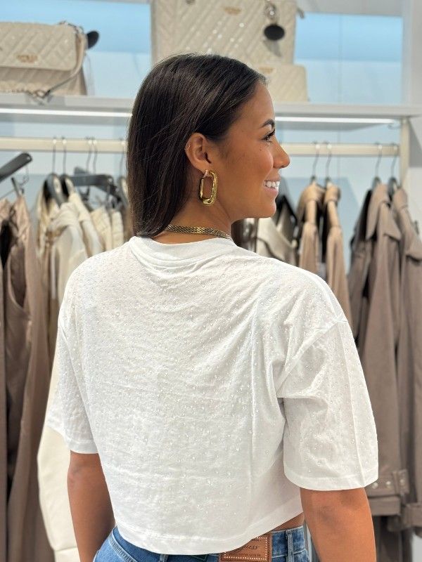Het GUESS Ss Rhinestone Crop Os Tee in wit is je perfecte zomer T-shirt. Dit witte dames T-shirt met korte mouwen heeft een trendy ronde hals en een coole cropped fit voor een eigentijdse uitstraling. De strass steentjes zorgen voor een sprankelende touch, ideaal voor wie graag extra shine in haar outfit wil. Draag dit GUESS T-shirt met je favoriete high-waisted jeans of rok voor een complete look. Voeg dit witte GUESS T-shirt toe aan je garderobe en straal met flair!