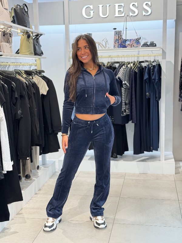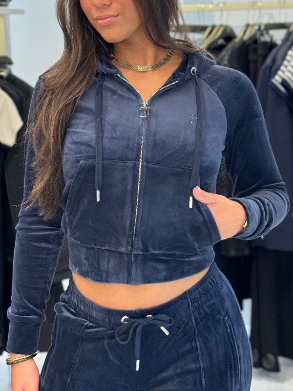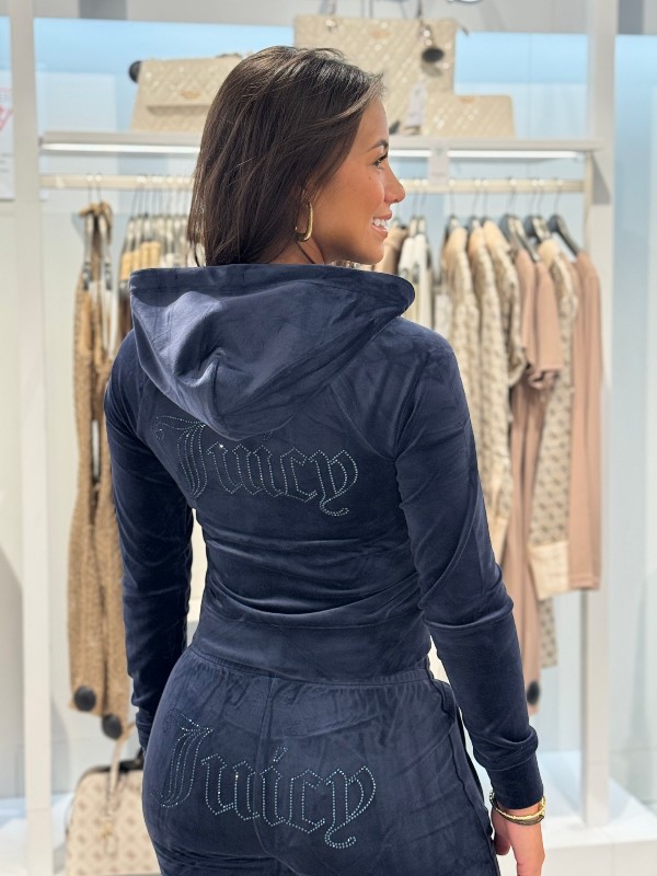 De Juicy Couture blauwe Madison Col Out Hoodie is een trendy toevoeging aan je kledingkast. Dit damesvest is vervaardigd van zacht velour en heeft een comfortabele pasvorm. Het vest heeft een opvallende print op de rug en is afgewerkt met strass steentjes, wat een glamoureuze touch toevoegt. Voorzien van een ritssluiting en handige steekzakken, is deze hoodie perfect voor dagelijks gebruik. De capuchon biedt extra comfort bij koelere dagen. Combineer met de bijpassende broek voor een complete look. Met het grote Juicy Couture logo op de achterzijde maak je een fashionable statement. Style jezelf in deze blauwe Juicy Couture hoodie!