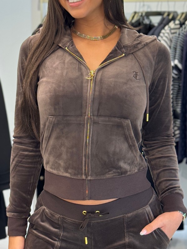 De Juicy Couture Robertson Hoodie in bruin is je nieuwe favoriete dames vest. Dit bruine vest is gemaakt van comfortabel velours materiaal en heeft een capuchon voor een relaxte vibe. De rits maakt het makkelijk om dit vest aan en uit te trekken. Combineer het met de bijpassende Juicy Couture broek voor een complete look. Haal de Juicy Couture Robertson Hoodie in huis en upgrade je dagelijkse outfit moeiteloos.