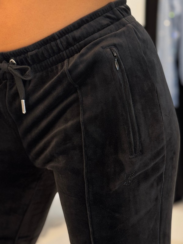 De Juicy Couture Tina Col Out Trackpants in zwart is de perfecte dames joggingsbroek voor een stijlvolle en comfortabele look. Gemaakt van velours materiaal, biedt deze zwarte Juicy Couture broek ultiem draagcomfort. De elastische band met koord zorgt voor een fijne pasvorm, terwijl de ritszakken ruimte bieden voor je essentials. De broek is afgewerkt met sprankelende strass steentjes voor een glamoureuze touch. Ideaal voor een casual dagje uit of een ontspannen avond thuis. Voeg wat glans toe aan je loungewear met deze Juicy Couture trackpants.