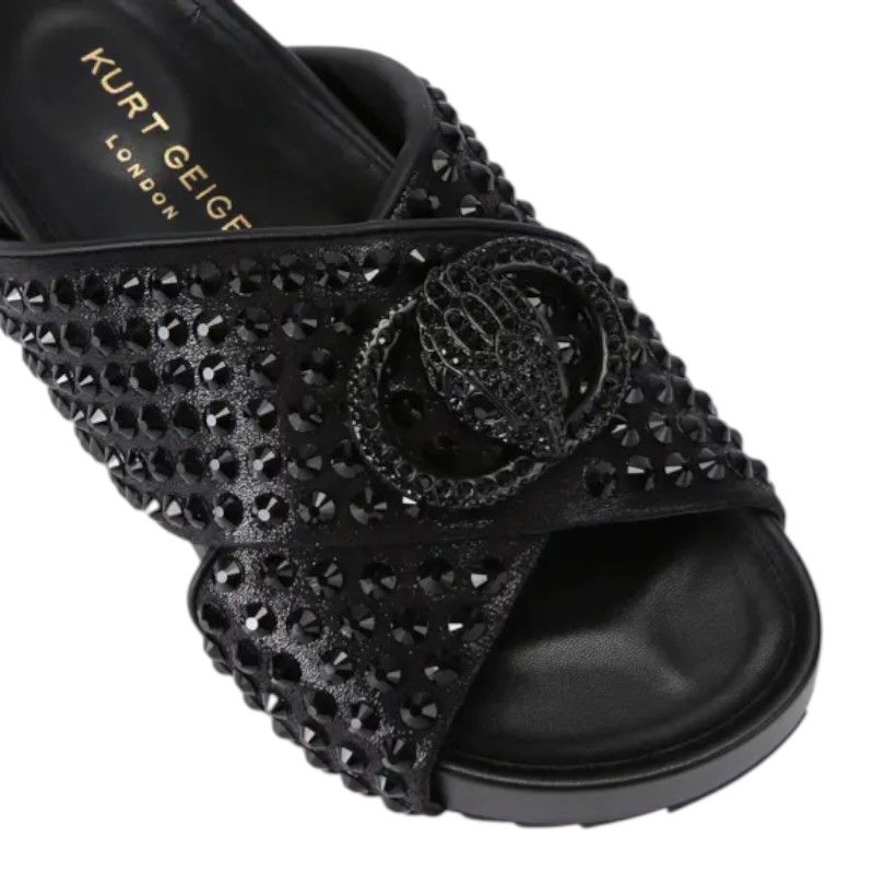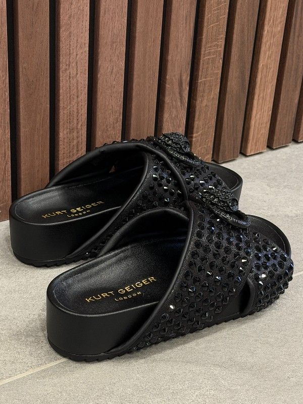 De Kurt Geiger Chelsea Cross Strap Dr slippers in het zwart zijn een opvallende aanvulling op je dagelijkse stijl. Deze zwarte dames slippers trekken de aandacht met hun strass steentjes en het herkenbare Eagle logo. De slippers hebben dikke zolen voor extra comfort, ideaal voor ontspannen dagen. Kurt Geiger laat wederom zien hoe je fashion en comfort kunt combineren. Voeg deze zwarte Kurt Geiger slippers toe aan je collectie en stap stijlvol de deur uit!