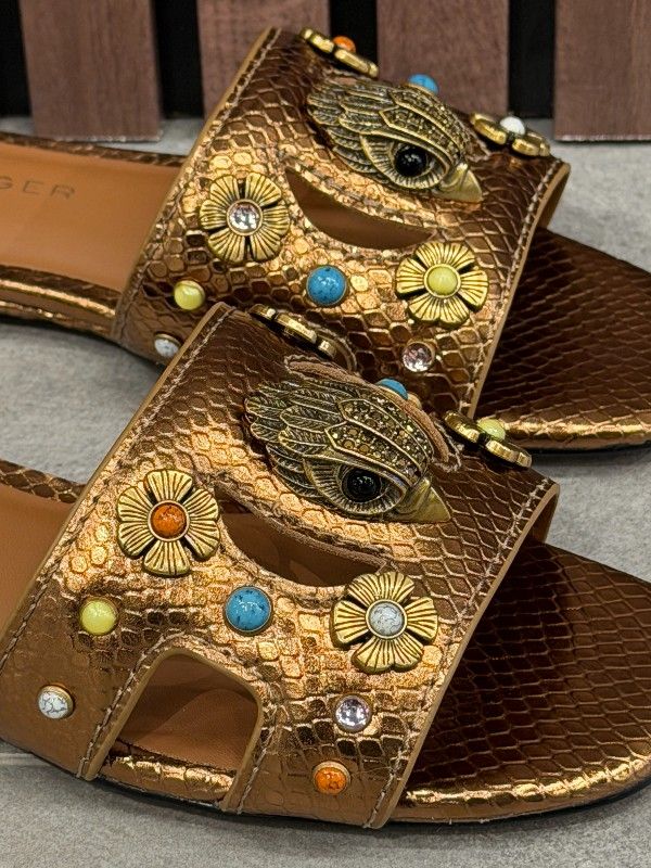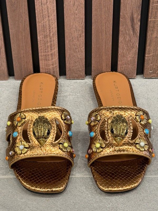 De Kurt Geiger Eagle Cut Out Flat Sandal in brons is dé must-have voor elke fashionista. Deze dames slippers met bandje hebben een opvallend design dankzij de unieke cut-out details. De bronzen kleur van de slippers geeft een trendy twist aan je zomerse outfits. Perfect voor een dagje in de stad of een relaxte strandwandeling. De Kurt Geiger slipper biedt stijl en comfort in één. Maak je collectie compleet met deze bronzen eyecatcher. Mis deze kans niet om je look nog meer te laten stralen!