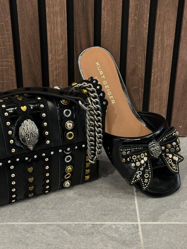 Chique zwarte Kurt Geiger slipper met een statement strik, versierd met goud- en zilverkleurige studs. Perfect te matchen met de bijpassende Kurt Geiger tas met strik!