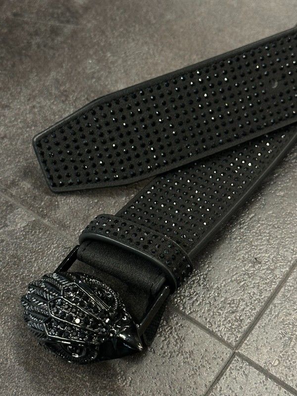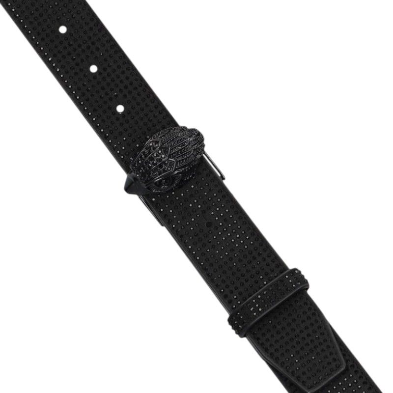 Deze Kurt Geiger riem is volledig bewerkt met zwarte strass steentjes. Aan de voorzijde zit de welbekende Kurt Geiger adelaarskop met zwarte steentjes.