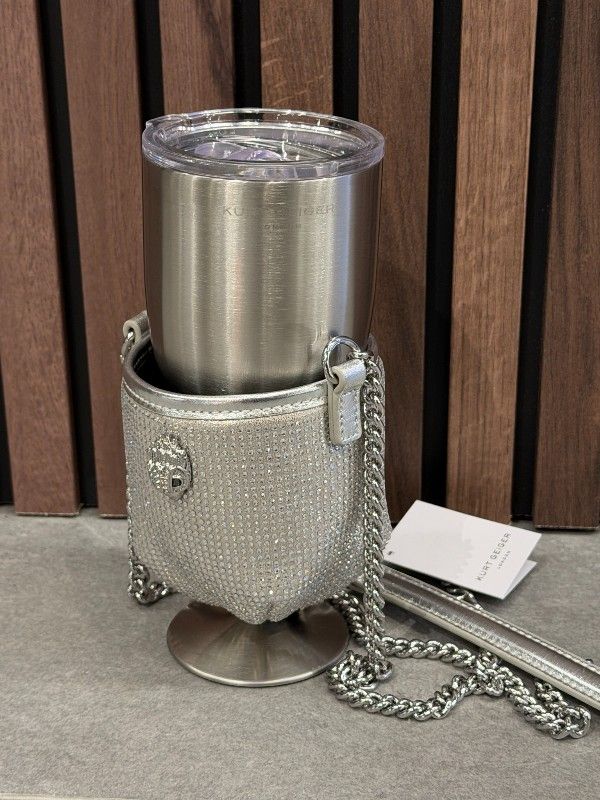 De Kurt Geiger Kensington Wine Glass XB in zilver is een opvallend fashion-item dat je draagt als een tas en gebruikt als (wijn)beker. Dit luxe zilveren wine glass is voorzien van het iconische eagle logo en een lange band om het crossbody te dragen. Perfect voor een avondje uit, festival of trendy look waarbij stijl en fun samenkomen. Een echte statement piece van Kurt Geiger.