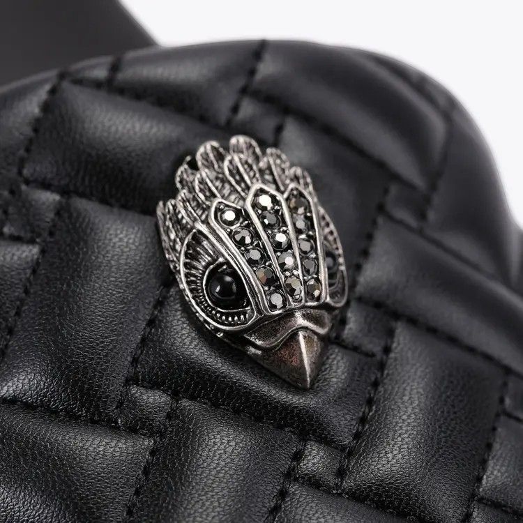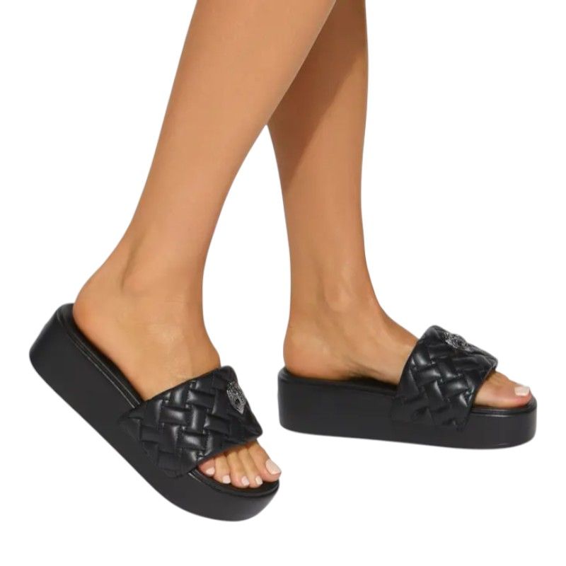 De Kurt Geiger Meena Eagle Platform slippers voegen een trendy flair toe aan je schoenencollectie. Deze zwarte slippers voor dames hebben stevige, dikke zolen van 5 cm dik die zorgen voor extra comfort en hoogte. Het opvallende Eagle-logo van Kurt Geiger op de band maakt ze helemaal on-trend. Perfect voor een casual dagje uit of om je zomeroutfit een stoere touch te geven. Ontdek de veelzijdigheid van deze zwarte Kurt Geiger slippers en maak een statement met elke stap!