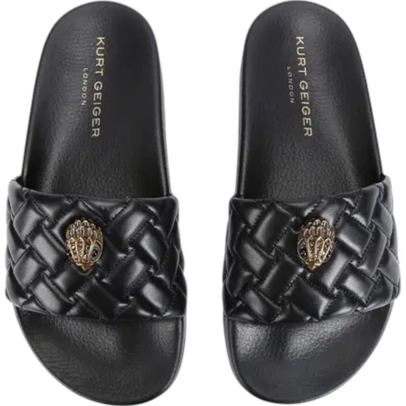 Deze zwarte Kurt Geiger slippers zijn bewerkt met een goudkleurige adelaarskop. De slippers hebben een erg fijn voetbed dat erg flexibel is.