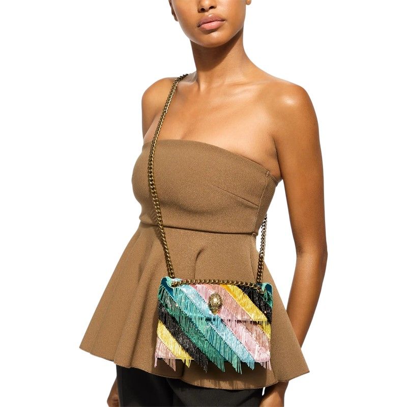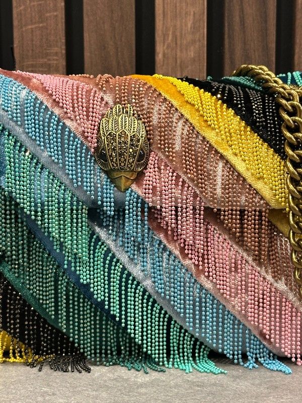 Maak kennis met de levendige en trendy Mini Kensington Fringes damestas van Kurt Geiger! Deze meerkleurige mini crossbody is gemaakt van luxe velvet en voorzien van een opvallend Eagle logo. Draag hem als een schoudertas of gebruik de verstelbare band om hem crossbody te dragen. De tas heeft een handige magnetische knoopsluiting, waardoor je snel bij je spullen kunt. Perfect te combineren met bijpassende schoenen of een kleurrijke outfit. Een must-have accessoire dat elke look afmaakt! Vind jouw nieuwe favoriet op onze website en steel de show.