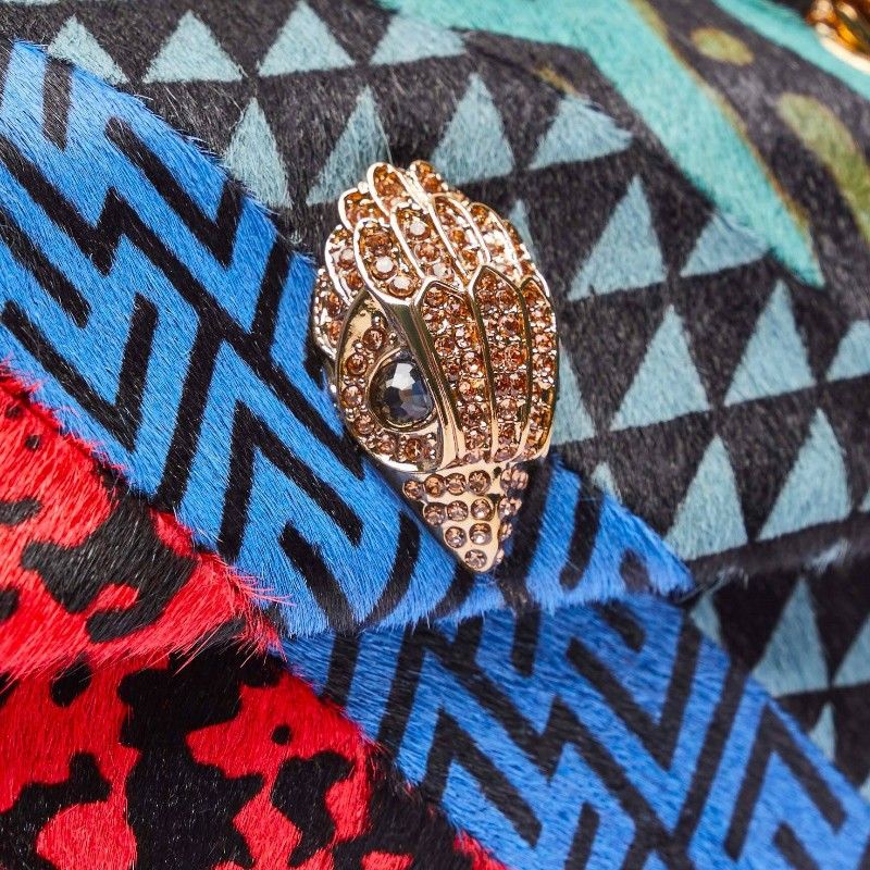 De Kurt Geiger Mini Kensington tas is uitgevoerd in een kleurrijk design met verschillende prints. Op de voorzijde zit het herkenbare adelaarskop-detail. De tas sluit met een magnetische druksluiting.