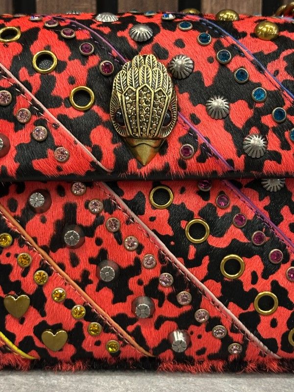 Deze rode Kurt Geiger tas is afgewerkt met verschillende stijlvolle details, waaronder een zwarte leopard print. De tas sluit met een magnetische druksluiting en heeft een gouden adelaarskop op de voorzijde.