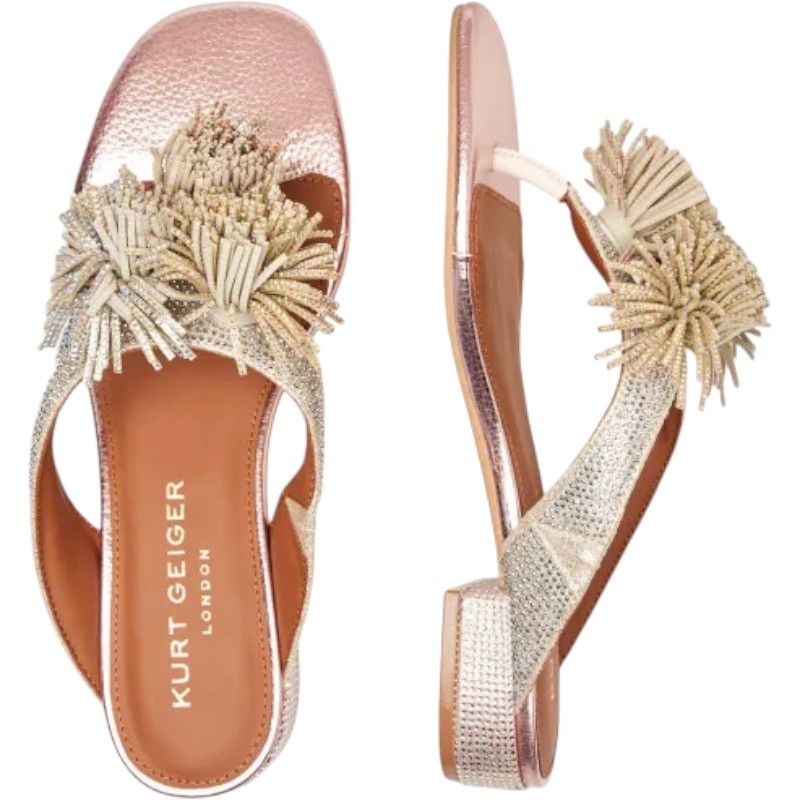 De Kurt Geiger Pom Pom T-bar Flat SDL in rosé is een must-have voor jouw zomercollectie. Deze dames teenslippers hebben schitterende strass steentjes, die elke outfit een sprankelende touch geven. De rosé kleur maakt deze slippers perfect voor zonnige dagen. Met de Kurt Geiger slippers voel je je stijlvol en klaar voor elk avontuur. Voeg deze mooie rosé slippers van Kurt Geiger toe aan je garderobe en shine tijdens elke zonnige dag!