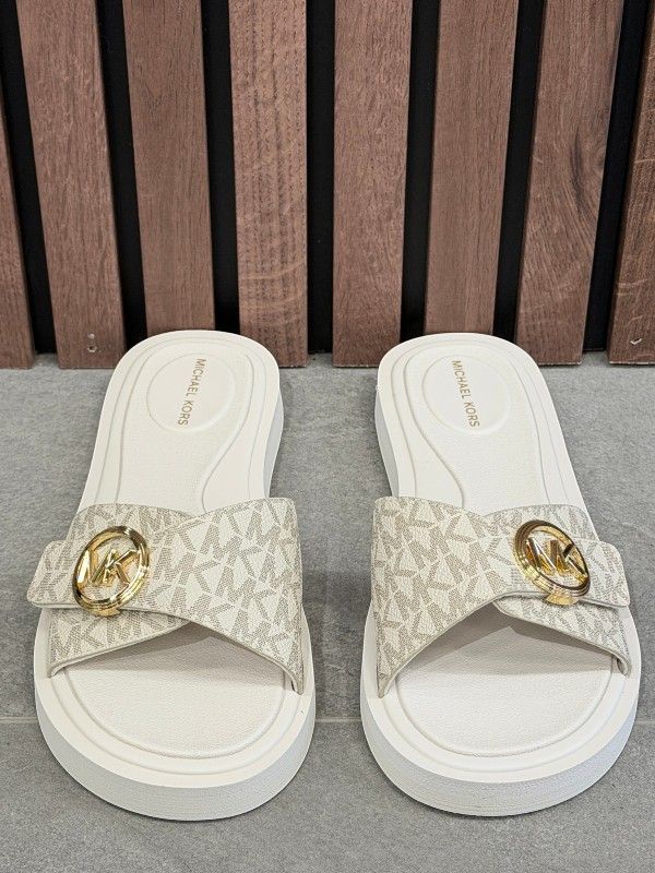 De Michael Kors Mk Pool Slide in beige is jouw nieuwe favoriete slipper voor zomerse dagen. Deze dames slippers hebben een opvallende logoprint die echt in het oog springt. De comfortabele band zorgt voor een fijne pasvorm en maakt ze eenvoudig aan en uit te trekken. Perfect voor een relaxte dag bij het zwembad of een casual look in de stad. Kies voor de beige Michael Kors Mk Pool Slide met iconische logoprint en stap stijlvol de zon in.