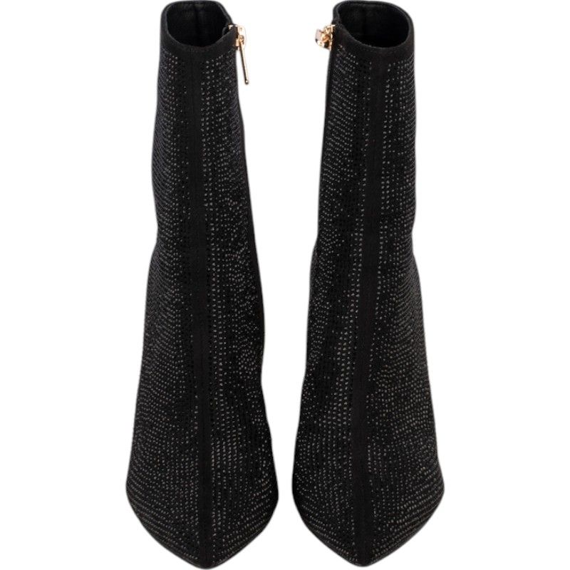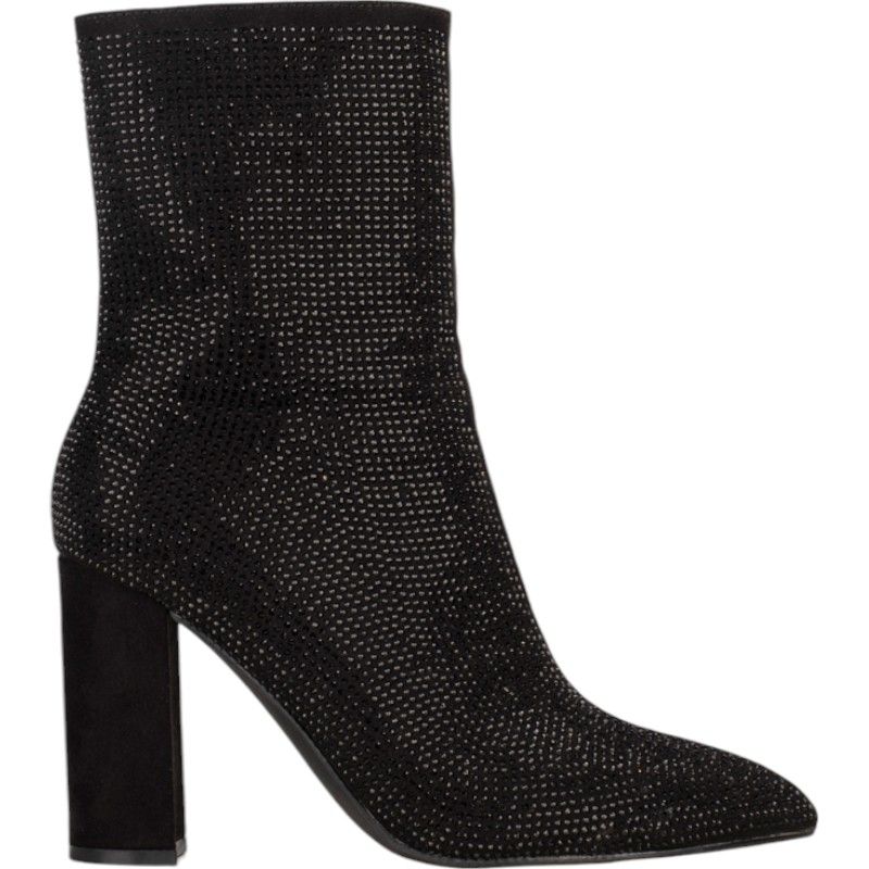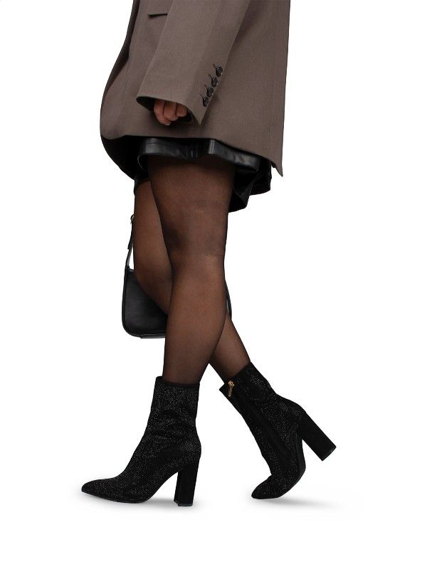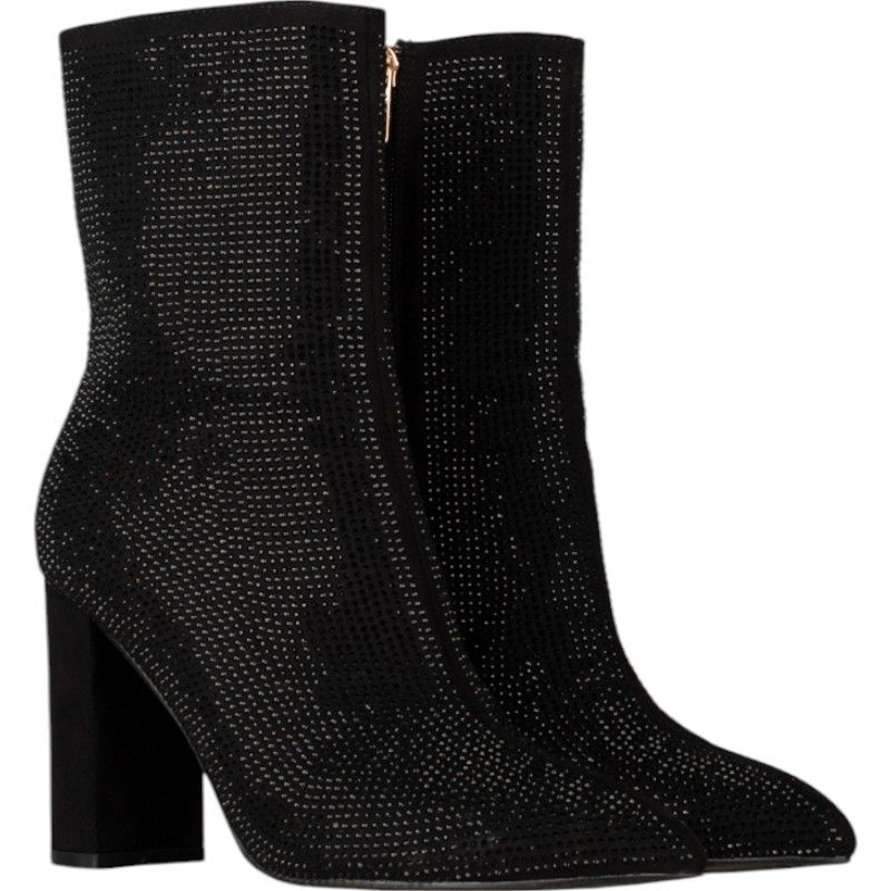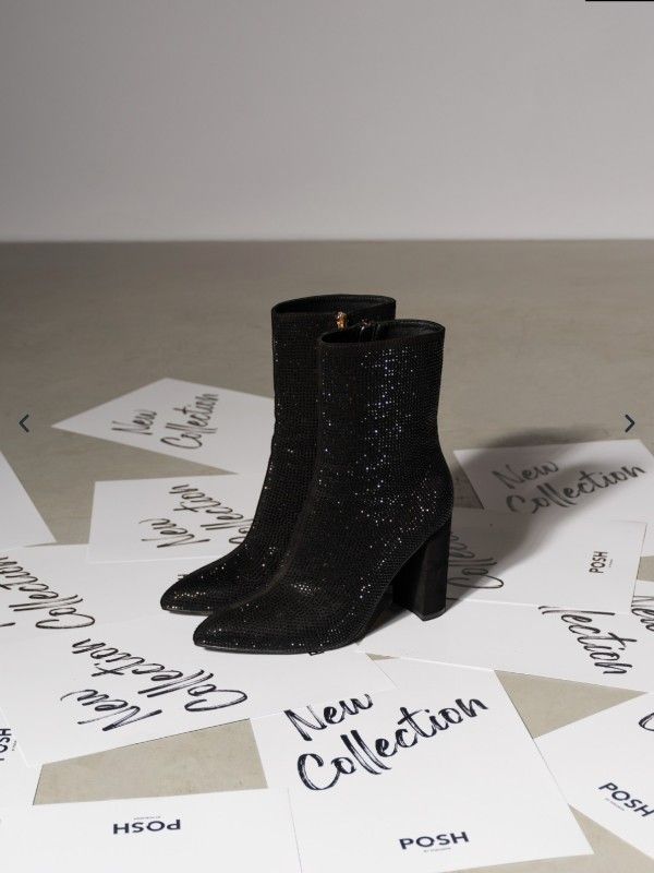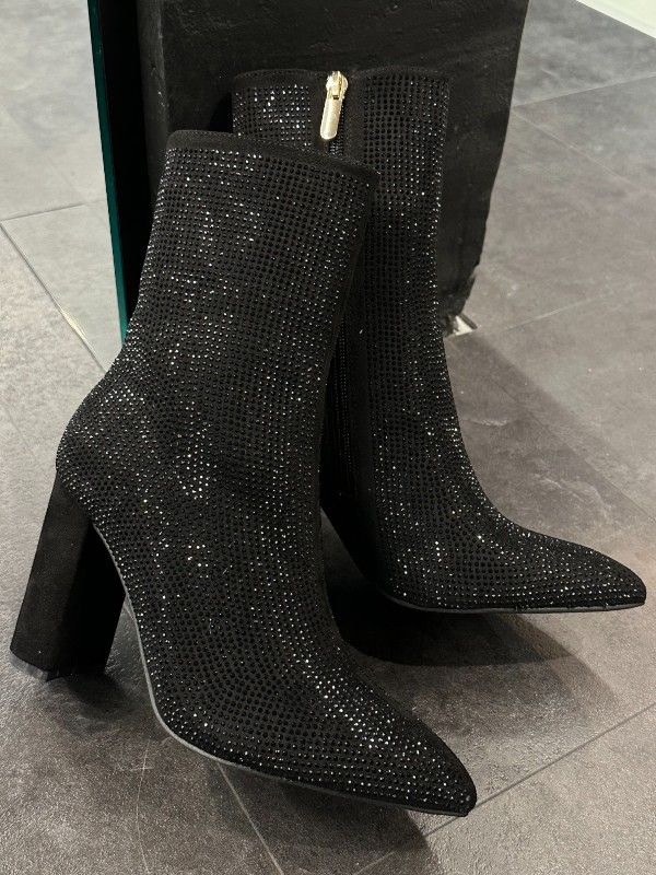 Deze mooie zwarte Poelman laarsjes hebben stevige hakken van ruim negen centimeter hoog en zijn bewerkt met all-over strass steentjes. De laarsjes zijn aan en uit te trekken met een rits aan de binnenzijde.