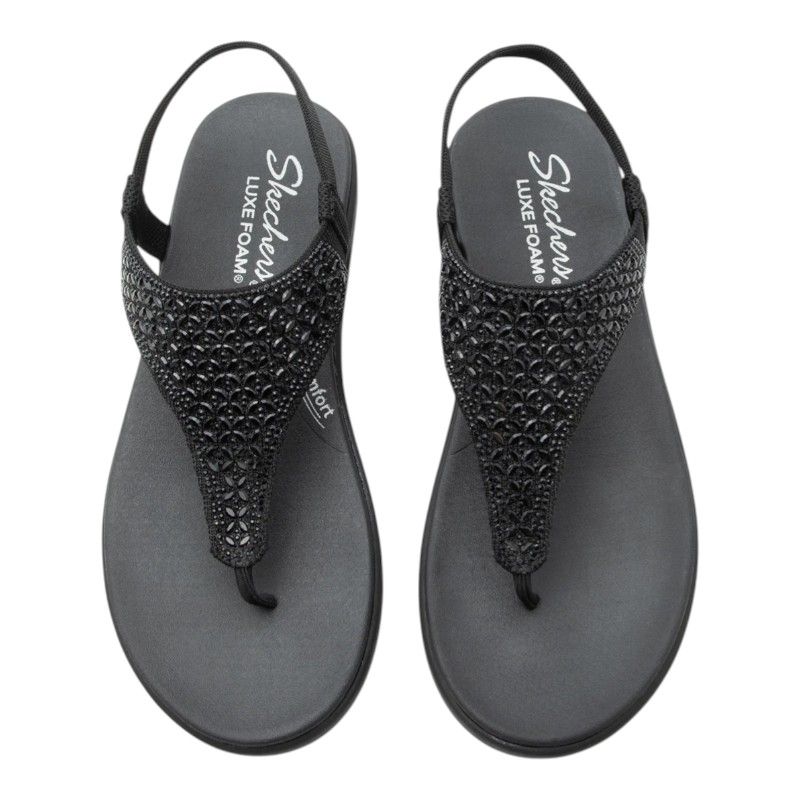 De Skechers Meditation Luxe Modern Event sandalen in zwart brengen stijl naar een hoger niveau. Deze dames sandalen zijn plat en versierd met opvallende strass steentjes, waardoor ze meteen een statement maken. Perfect voor een zomerse dag of een avondje uit, zonder in te boeten op comfort. De trendy zwarte Skechers sandalen combineren moeiteloos met elke outfit. Voeg wat sparkle aan je look toe en geniet van modieus comfort met deze sandalen van Skechers. Ontdek hoe deze zwarte sandalen jouw stijl kunnen verrijken en schitter op elke gelegenheid!