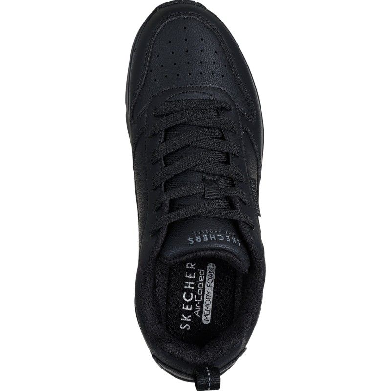 Deze zwarte herensneakers van Skechers hebben air-zolen waardoor de schoenen een goede demping hebben. Aan de zijkant en op de tong vind je het logo.