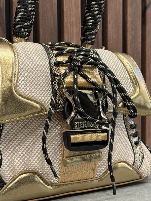 De Steve Madden Bdiego-B in goud is de must-have crossbody tas voor elke trendsetter. Deze gouden damestas heeft een verstelbare band, zodat je kunt schakelen tussen een schoudertas en een crossbody look. De tas is afgewerkt met schitterende strass steentjes die het iconische Steve Madden logo een sprankelende touch geven. Deze Steve Madden tas voegt direct glamour toe aan je outfit. Perfect voor een avondje uit of een dagje shoppen. Match deze tas met de bijpassende sneakers.