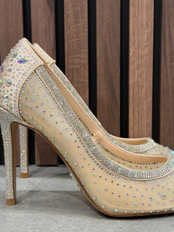 Maak kennis met de Steve Madden Encaged pumps in beige! Deze elegante pumps zijn voorzien van sprankelende strass steentjes, die je look direct een glamoureuze touch geven. Met een hakhoogte van 9 centimeter creëer je een stijlvolle en zelfverzekerde uitstraling. De neutrale beige kleur maakt deze Steve Madden pumps makkelijk te combineren met allerlei outfits. Of je nu naar een feestje gaat of een avondje uit, deze pumps trekken zeker alle aandacht. Voeg een beetje sparkle toe aan je collectie met de Steve Madden Encaged in beige!