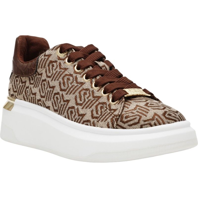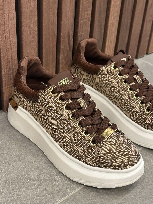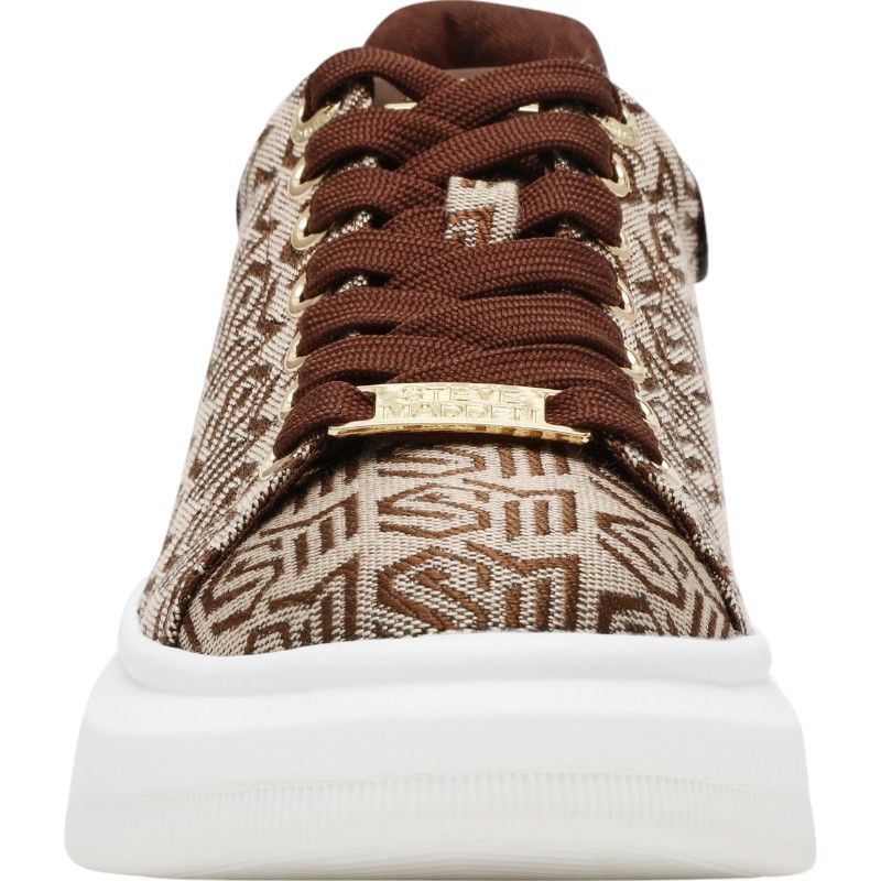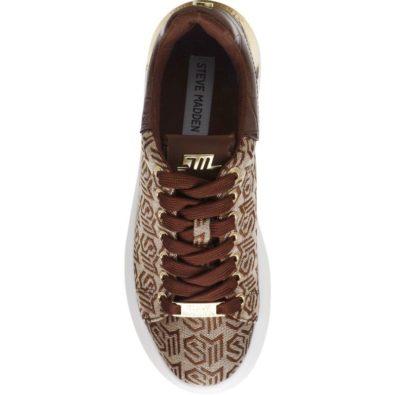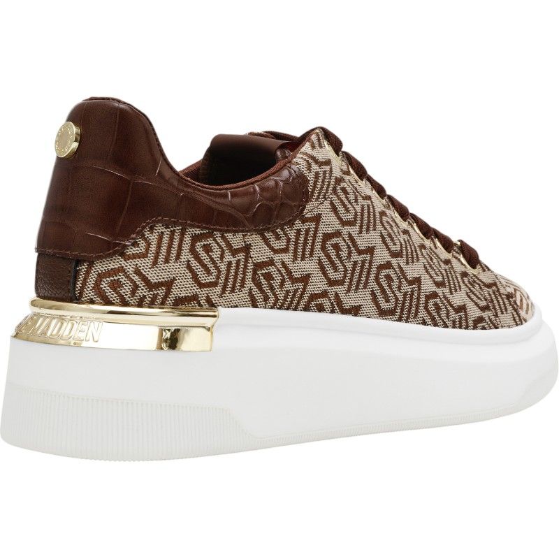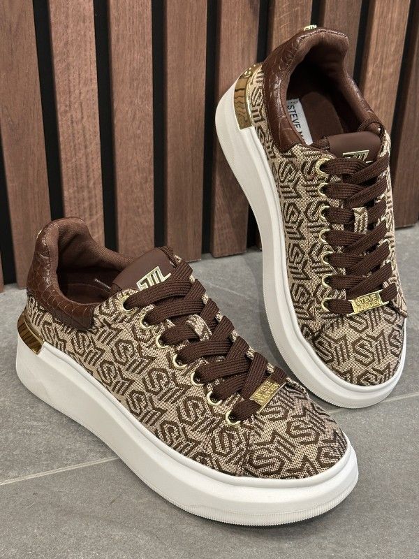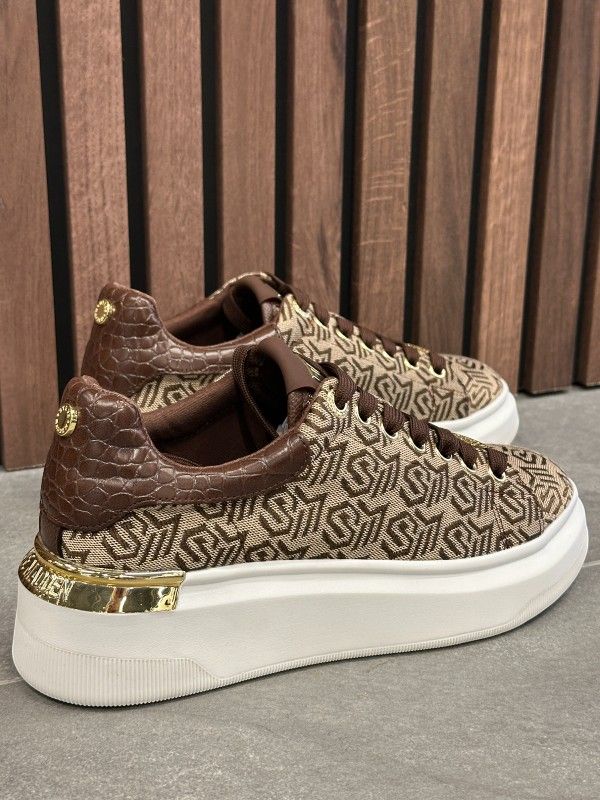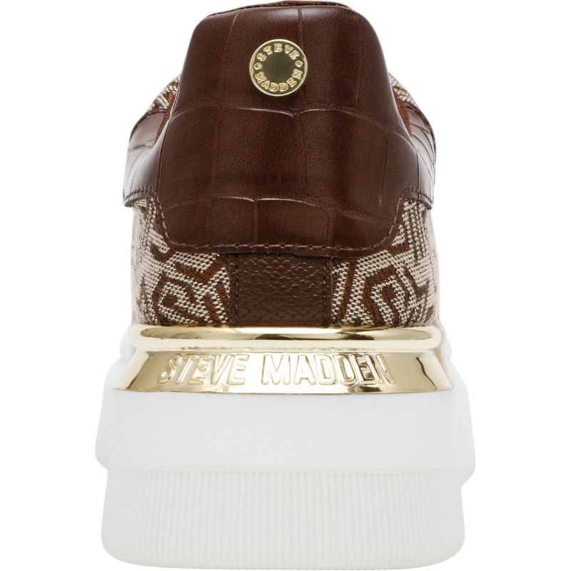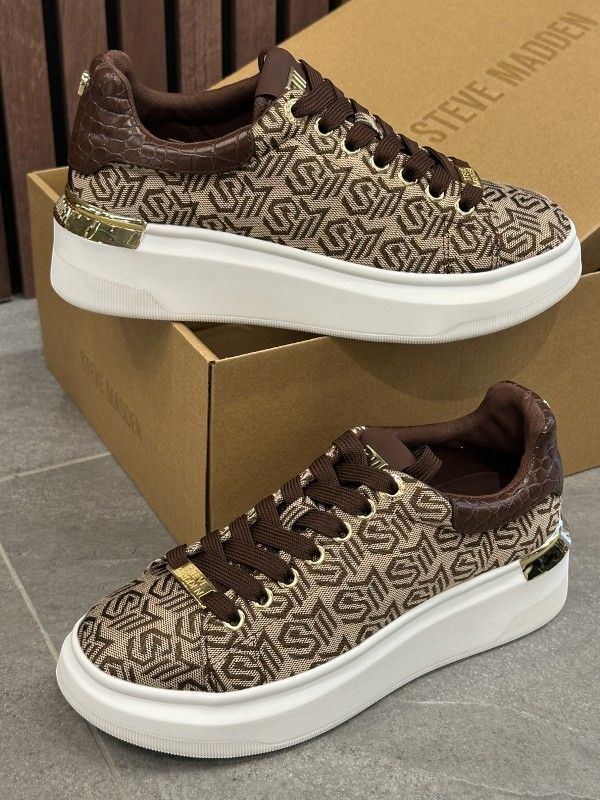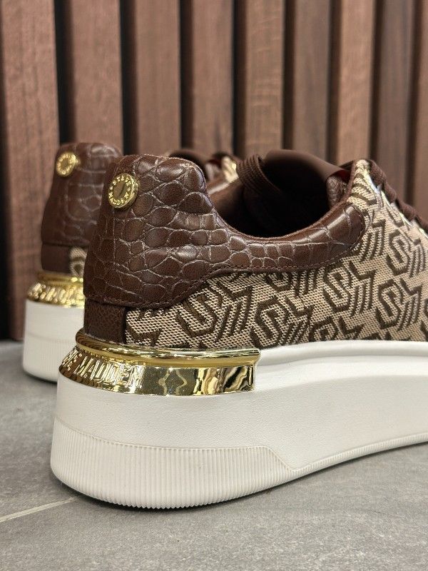 Deze nieuwe Steve Madden sneaker is een echte blikvanger. De schoen is volledig bedrukt met het herkenbare Steve Madden-logo en heeft een opvallende hiel in bruine krokodillenprint. Gouden details geven de sneaker een luxe touch, terwijl de witte zool zorgt voor een frisse en sportieve afwerking. Een perfecte mix van trendy en stijlvol.