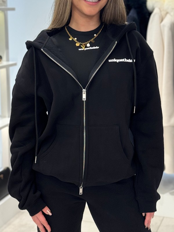 Het Unique The Label Imani vest in zwart is een must-have dames vest. Dit zwarte vest heeft een comfortabele capuchon en een handige ritssluiting. Met de steekzakken en een zachte binnenzijde, is dit vest perfect voor elke dag. Combineer het met de bijpassende broek voor de complete look. Het Unique The Label vest is een veelzijdige toevoeging aan je garderobe. Mis deze kans niet om je stijl eenvoudig te upgraden!